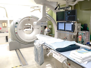 血管撮影装置と手術台が組み合わさった手術室となっているためペースメーカーや植え込み型除細動器(ICD等)の留置,大動脈弁狭窄症に対する大動脈弁置換術(TAVI)や胸部・腹部大動脈瘤に対するステントグラフト留置といった様々な手技に対応可能となっています。