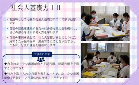 社会人としての働き方を学び、組織の中で役割を果たすとともに、看護専門職としてクリニカルラダーレベルⅠに示している基本的な看護実践ができていることを目指します