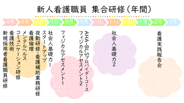 入職から1年間、社会人としての成長と看護職としての基本的な看護実践ができるようプログラムにのっとり様々な研修をおこないます
