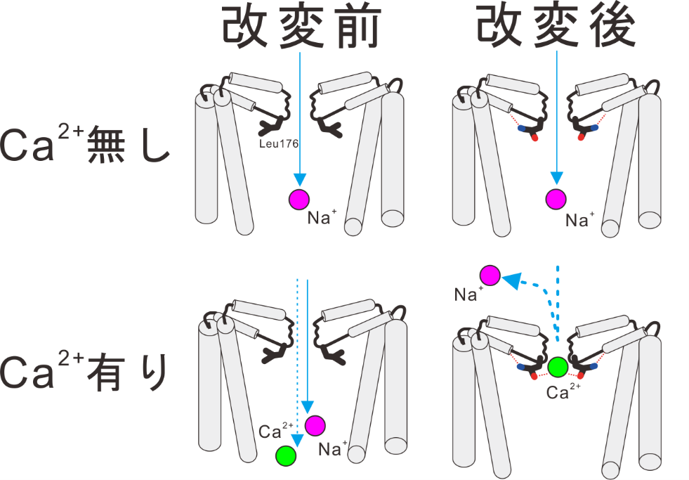 カルシウムイオンのような多価陽イオンがないときはイオンの通り道に強くとどまるイオンは存在せず、どちらのイオンチャネルでもナトリウムイオンの通り抜けが起き、イオン電流が発生する。改変前のチャネルでは、イオンポア内の親水性が低いため、カルシウムイオンがイオンポア内に強くとどまることができないため、カルシウムイオンによる電流の減少は起きない。一方で、イオンポア内の親水性が増加した改変チャネルでは、増加した親水性によってカルシウムイオンが強くイオンポア内にとどまるため、ナトリウムイオンが通れなくなりイオン電流が減少する