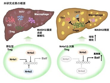 - T細胞特異的にNr4aを欠損したマウスはMASHに抵抗性を示した。このマウスでは、肝臓内の制御性T細胞(Treg)が顕著に増加し、その抗炎症機能も強化されていた。